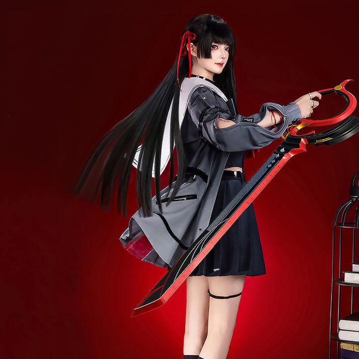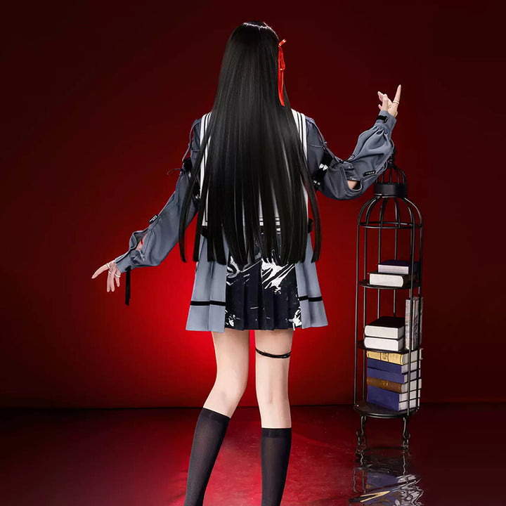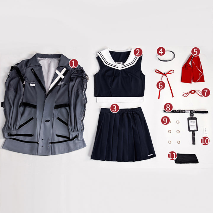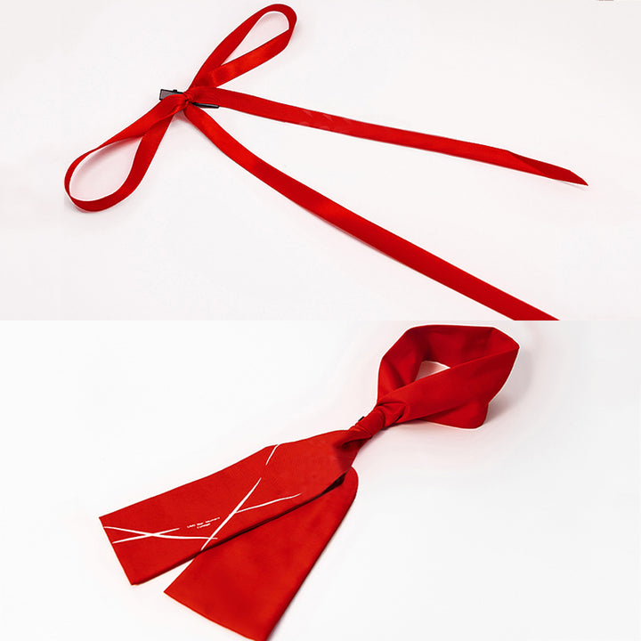 - Package Includes: Top, Coat, Skirt, Neckwear, Scarf, Bowtie hairpin, Belt+Waist badge, Ring*6, Stockings, Tattoo stickers, Red rope